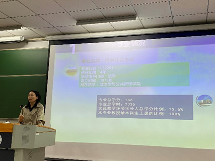 会议过程中,各专业代表教师先后从专业发展历史、师资情况、教学资源、学生发展等一系列方面介绍了所属专业的具体情况。行政管理系主任孙宗锋老师详细阐述了学院行政管理专业的多种研究方向与良好的教学实习资源,勉励同学们认真学习,努力拼搏。政治学与行政学系主任唐睿老师着重谈到了学子就读政治学与行政学专业的感受,鼓励同学们从自身兴趣出发进行专业选择。科学社会主义学系主任赵婷老师从专业情况、专业特色、专业定位等方面对学院科学社会主义专业进行了全面介绍,并分享了自身的求学经历。
