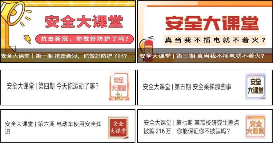 积极发挥融媒体在网络思政中的独特作用,以学院研究生会公众号为主要阵地,开设了“安全大课堂”专栏。此专栏以践行总体国家安全观,加强校园安全防范意识为宗旨,借助新颖、活泼、生动的线上宣传形式,分别以新冠疫情安全防护、“双十一”网络电信诈骗、校园电动车使用安全、校园消防安全为主题,截至目前,共发布7期推文。“安全大课堂”系列推文以贴合高校校园实际生活的案例,形象地列举了常见的校园安全问题,培养了同学们自护自救的知识和技能,给同学们敲响了安全警钟。