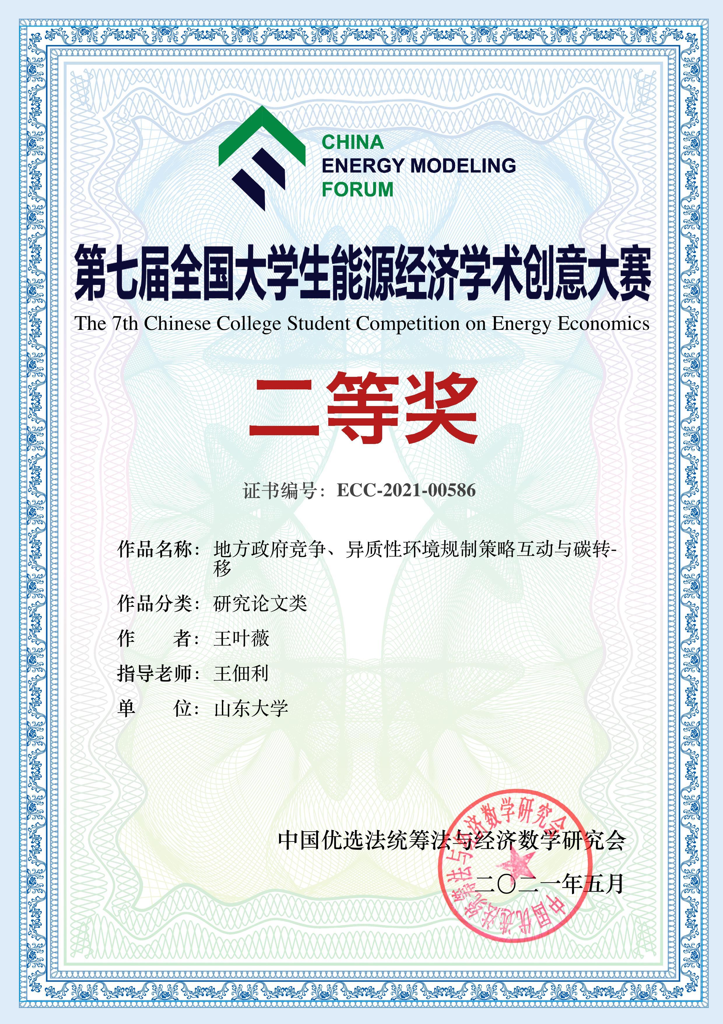 2、王叶薇撰写的《地方政府竞争、异质性环境规制策略互动与碳转移》获得第七届全国大学生能源经济学术创意大赛二等奖;