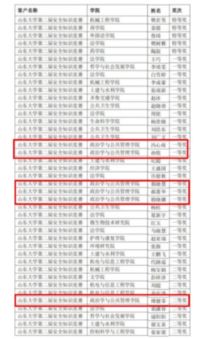 第二届安全知识竞赛暨第五届消防安全知识竞赛中,我院冯心雨、孙悦等同学获一等奖,付健菲、刘小娜等同学获二等奖,李兆欣、李丽等同学获三等奖;在山大研究生学术行为规范知识竞赛中,我院周雨琪、李贵香、杨歆琦等同学获三等奖,部分同学获优秀奖;