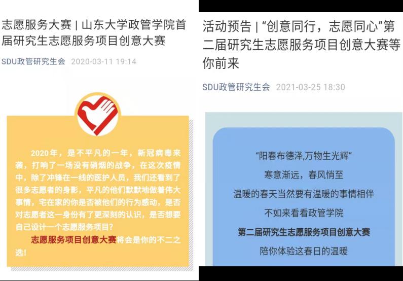 1、学院定期举办志愿服务活动创意大赛,以推动学院志愿服务项目的实施与落地,提高政管学子社会责任感;