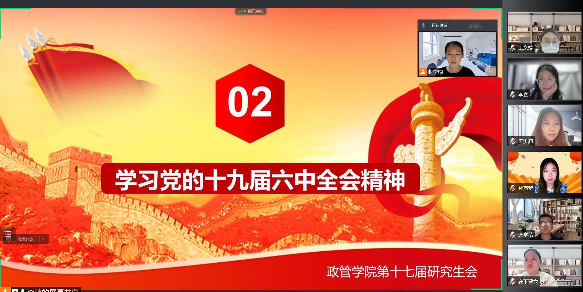 第二部分为学习党的十九届六中全会精神。通过学习党的十九届六中全会精神,提升了同学们立足中国国情、把准时代脉搏的现实关怀和理论思维能力,鼓励政管学子在新征程上要砥砺奋进、开拓创新、埋头苦干、勇毅前行。