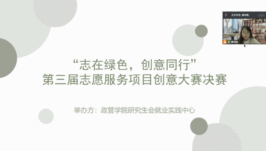 研究生会就业实践中心于3月7日—3月25日通过线上的形式举办了“志在绿色,创意同行”第三届研究生志愿服务项目创意大赛。本次大赛分为初赛与决赛两个环节,吸引了全院22支队伍共70余人的积极参与。