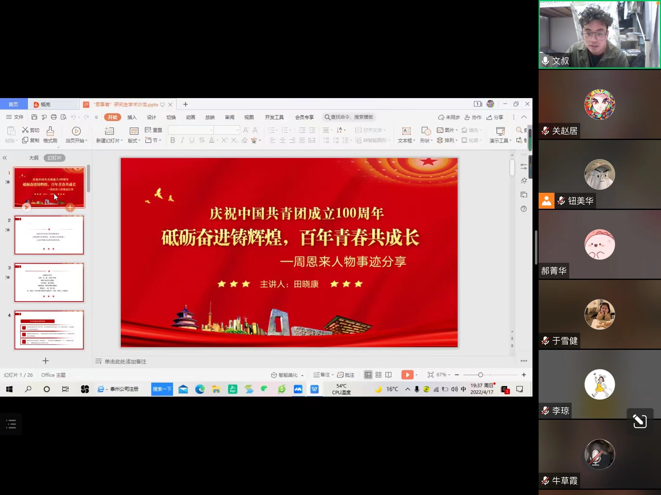 田晓康同学以周恩来总理的生平事迹为主线,对周恩来总理青年时期投身革命、组织中国社会主义青年团旅欧支部等事迹进行了介绍,并对周恩来总理在创建人民军队和创建革命统一战线中的伟大贡献进行了说明。他认为我们当代青年应努力向周恩来总理的崇高精神、高尚品德、伟大风范看齐,坚定“为中华之崛起而读书”的信念。