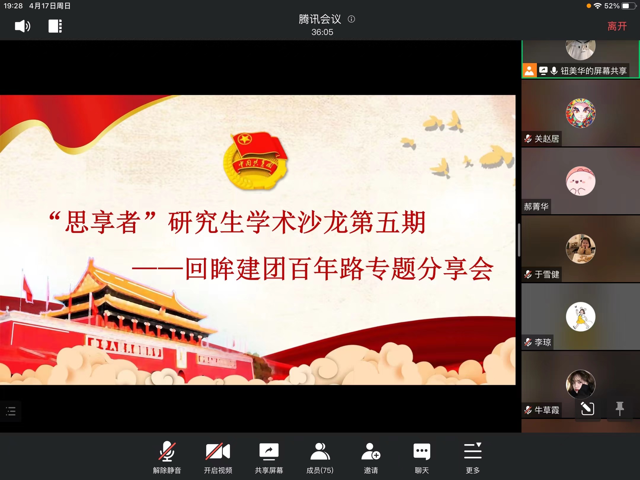 本期“思享者”研究生学术沙龙带领大家深入学习了共青团的百年历史,并围绕团史知识、重要人物等主题进行了分享交流,同学们也在深刻的感悟中通过小程序打卡的方式分享了自己的心得体会。做时代之萤火,谱青春之华章,本次“回眸建团百年路”专题分享活动以建团百年为契机,有利于激励广大青年学习团史,紧密团结在以习近平同志为核心的党中央周围,认真学习和贯彻习近平总书记关于青年工作的重要思想,踔厉奋发、笃行不怠。