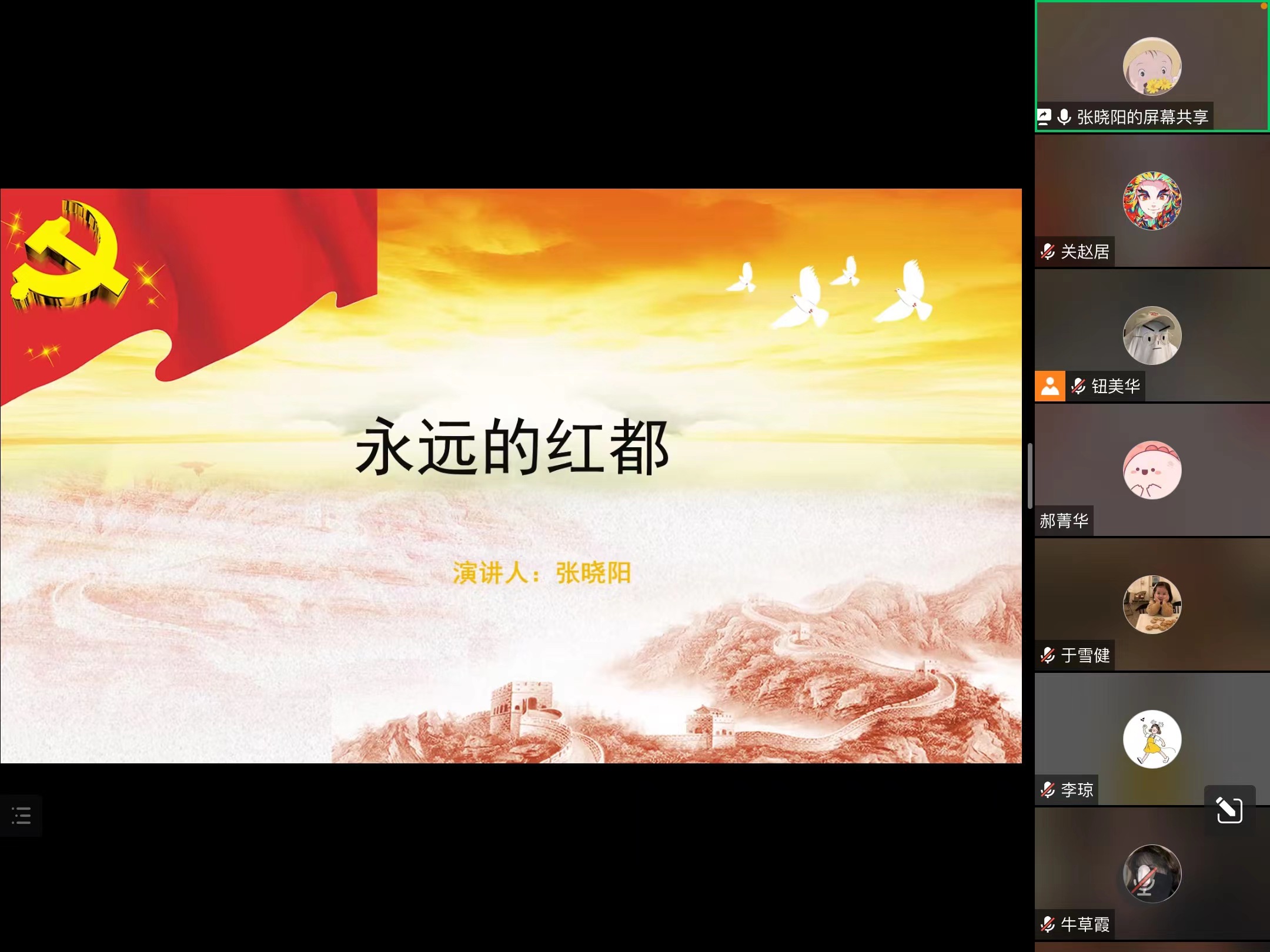 张晓阳同学以“永远的红都”为主题分享了党团结带领革命青年在瑞金发展壮大,取得人民群众的信任和支持,并且带领人民走向胜利的过程。她带领参会的同学们学习了由无数革命先辈用鲜血和生命铸就的伟大苏区精神,并指出了青年一代赓续红色基因、续写英雄篇章的重要性。