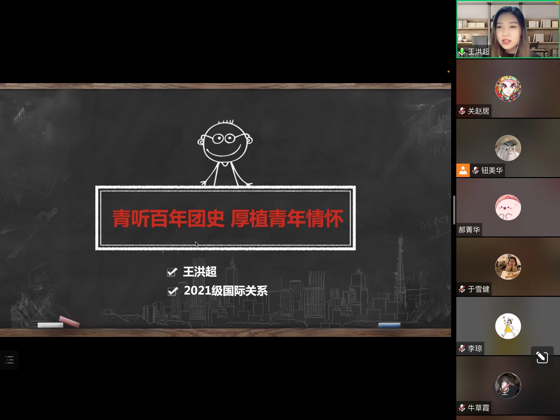 王洪超同学首先以“青听百年团史,厚植青年情怀”为主题进行了分享。她介绍了中国共青团历次全国代表大会、先进团员人物事迹等团史知识,以及团旗、团徽、团歌的来源。在总结环节,她认为共青团始终坚定不移跟党走,充分展现了共青团作为党的助手和后备军的担当。