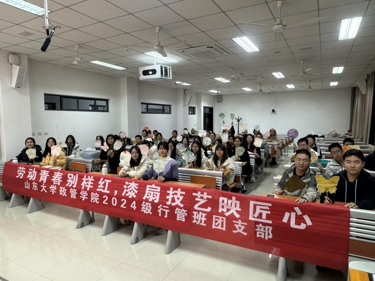 2024级行管班团支部在振声苑成功举办“劳动青春别样红,漆扇技艺映匠心”主题团日活动。本次活动由团支书周俊熹、宣传委员李姿霖主持,24级行管班全体同学共同参与。