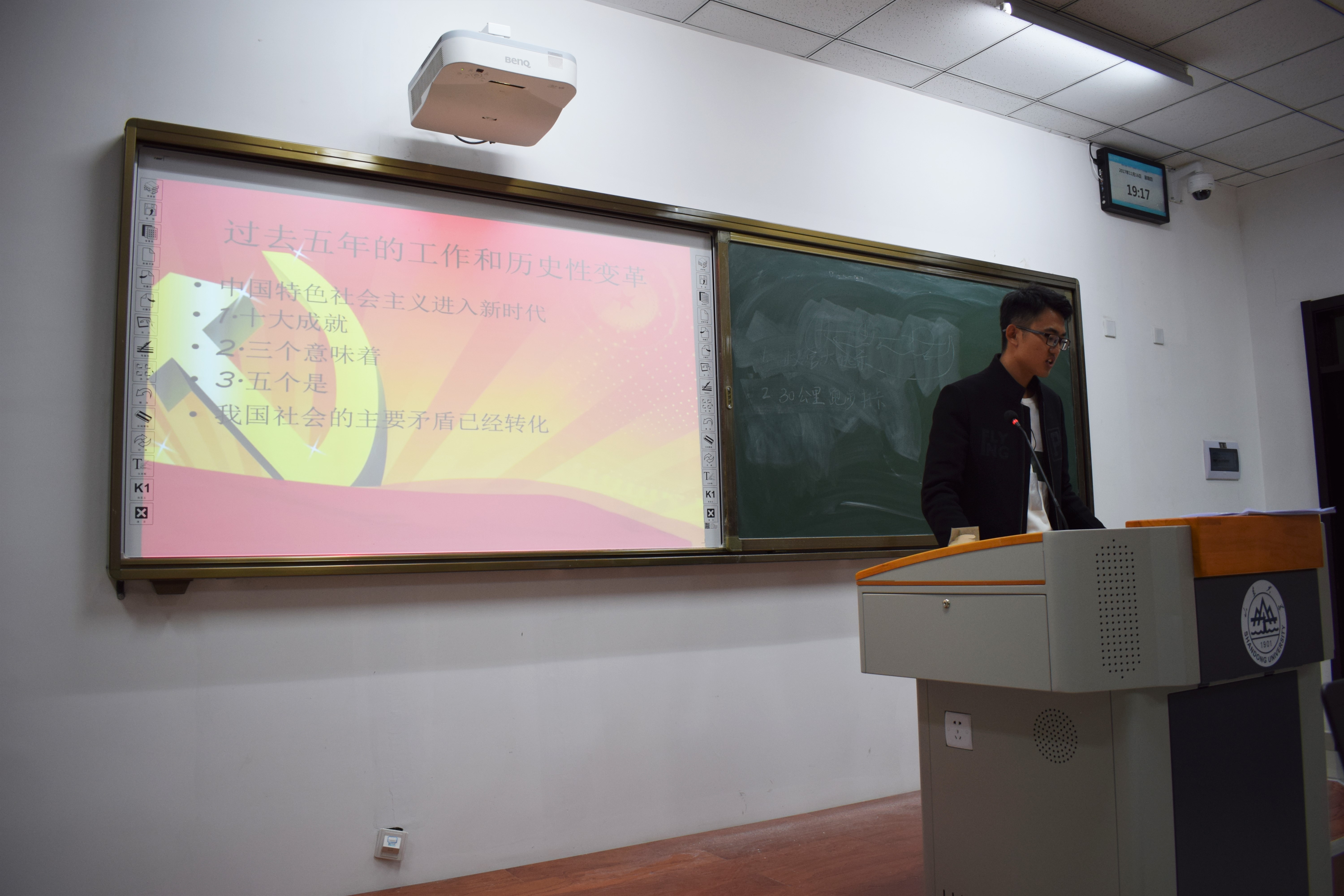 随后,在班长的带领下,同学们就党的十九大精神和社会中的许多热点问题进行了讨论,并且班内每个学习小组都派出一名代表对如何学习党的十九大精神作了精彩的发言。