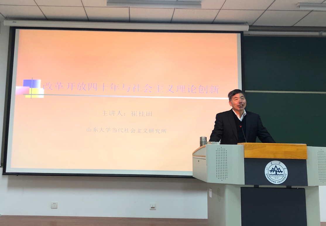 青年马克思主义研究会共同举办的改革开放四十周年与社会主义理论创新专题讲座在振声苑N202进行,本次讲座邀请当代社会主义研究所所长崔桂田教授进行主讲。