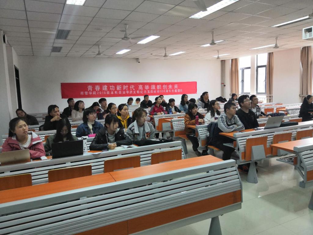 青年兴则国家兴,青年强则民族强。为传承五四精神,培养团员青年责任意识与国家观念,增强支部凝聚力与向心力,2018级政治学团支部积极响应上级号召,在全支部范围内举办了“青春建功新时代 高举旗帜创未来”纪念五四运动100周年系列活动。4月11日下午,系列活动总结大会暨纪念五四运动100周年主题团日活动在振声苑举行,支部45位团员青年全部到会,团日活动由团支部书记王一丹、班长武宸羽同学主持。