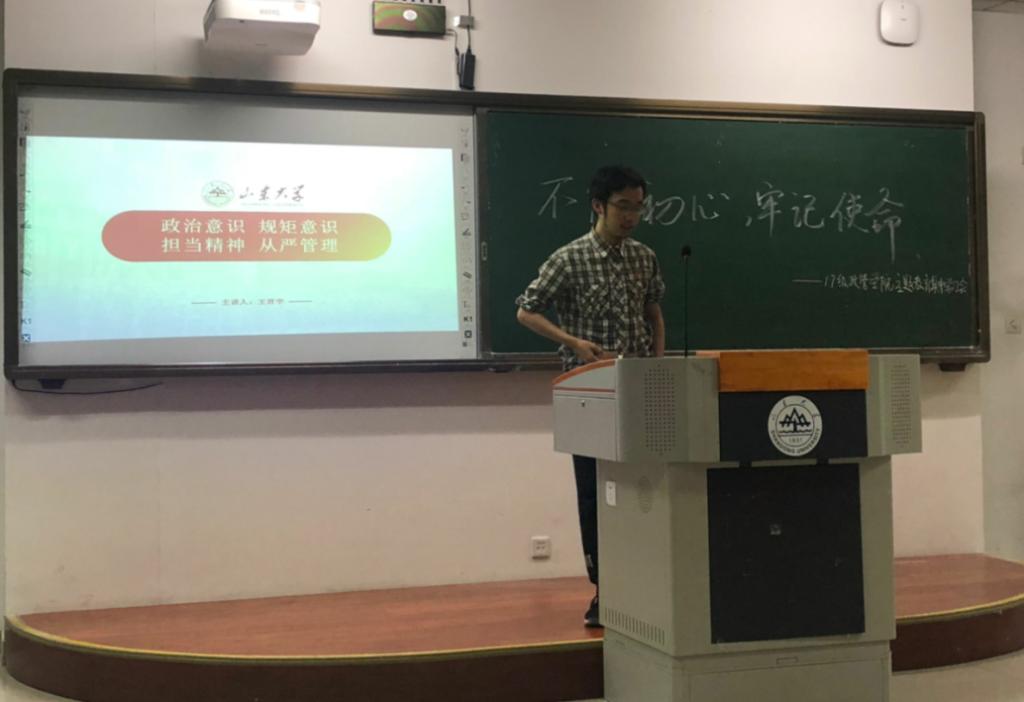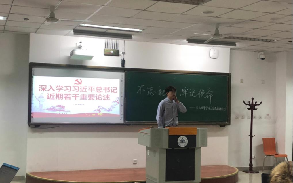 随后,党支部成员结合自身的工作实际,分享交流了“不忘初心、牢记使命”主题教育的学习体会,王君宇以政治意识 规矩意识、担当精神 从严管理为着眼点,联合具体案例,让同学们深刻地体悟到好干部要做到信念坚定、为民服务、勤政务实、敢于担当、清正廉洁。许宁同学就十八届中央纪委五次全会进行分享,生动阐明中国共产党从严治党首要的是严明党纪,要坚决克服组织涣散、纪律松弛现象,永葆党的先进性和纯洁性,启迪同学们冷静清醒判断形势,客观审视面对的挑战,树立必胜信心,加强党性修养。徐雅静同学就十九届中央政治局第六次集体学习时的重要讲话精神展开分享,告诉大家我们要保持坚强政治定力,有静气、不刮风,不搞运动、不是一阵子,踩着不变的步伐,把握节奏和力度,把党风廉政建设一步步引向深入。会上,同学们还积极发表自己关于“立德树人、三全育人”的看法,气氛热烈。
