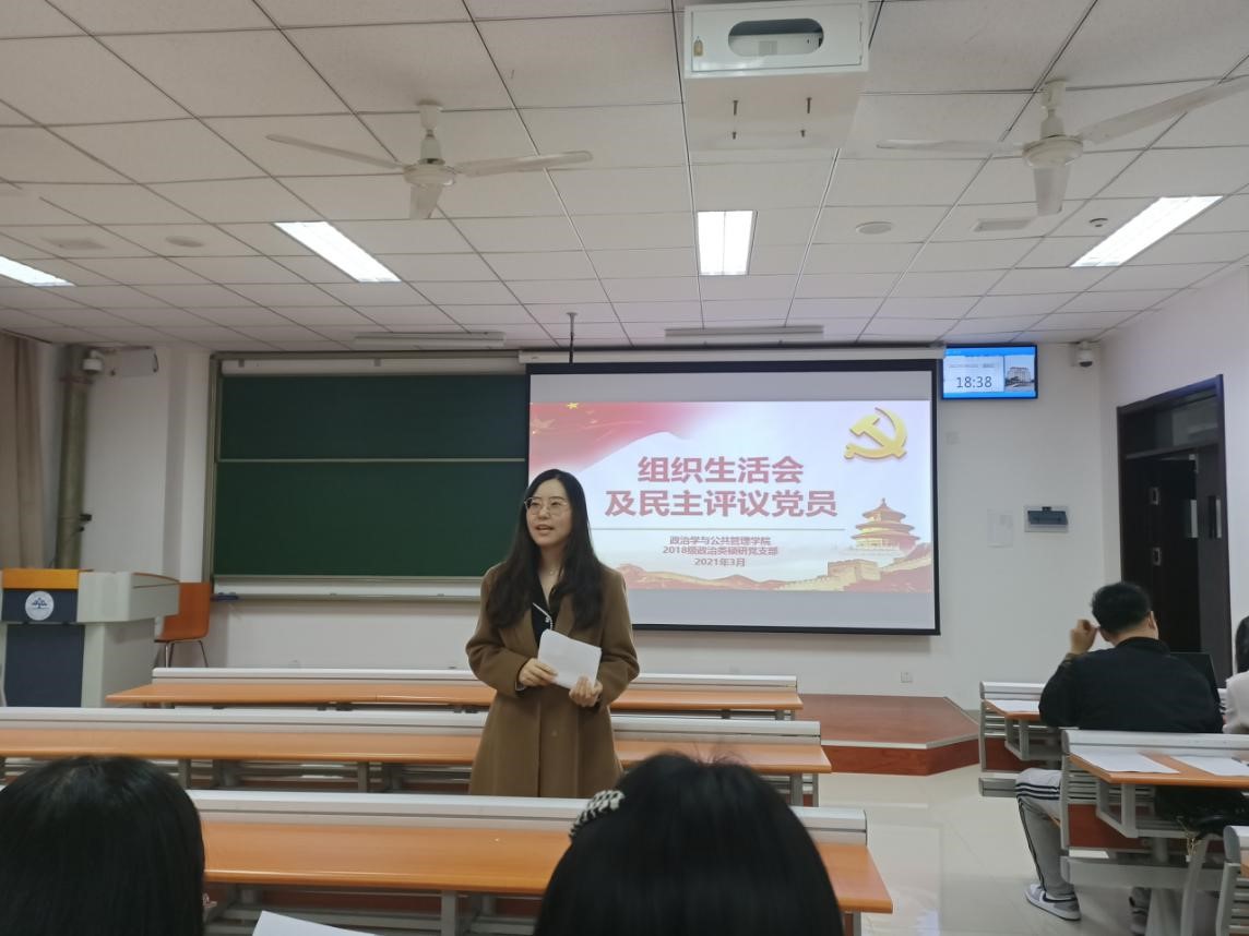 2018级政治类硕研党支部于3月12日晚在振声苑S206召开了2020年度组织生活会暨民主评议党员大会。会议由党支部书记孙艺鹏主持,2018级政治类硕研党支部全体党员参加,学院党委委员、辅导员李汉烨老师列席会议。