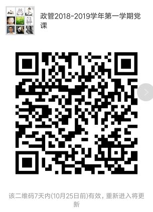 3.政管18-19上党课群二维码附下,仅供本期党课学员扫码入群,其他人员请勿加入。入群后立即修改昵称为实名,格式为“年级学历姓名”,如“2016本科张三”。