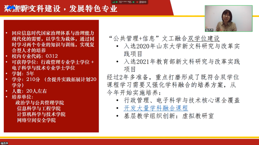 行政管理专业情况方面,楼苏萍分别从专业定位、历史沿革、特色优势、课程体系、师资队伍、建设支撑、建设成效等方面出发进行讲解,突出强调行政管理专业在学生培养方面优异成果。近年来,行管学子依托专业雄厚的师资力量与平台支撑,在学术科研、社会实践等领域接连取得突出成绩,在升学与就业方面获得良好的发展,专业毕业生质量也获得了各大高校与用人单位的一致好评。