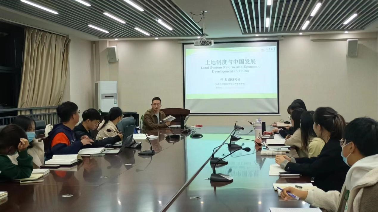 会议伊始,程龙由电影中的土地元素引出我国快速城镇化进城中的土地问题,并对“城市发展与粮食安全”“房地产与住房保障”“土地财政与经济发展”等热点问题进行分析。程龙结合自身实践经历和新闻报道进一步说明土地制度现存的问题及其影响,并向同学们推荐《直面中国土地问题》《城乡中国》两本书籍以便进行深入了解。会议最后,程龙邀请与会同学针对本书内容进行自由讨论,师生交流时间持续近两个小时。