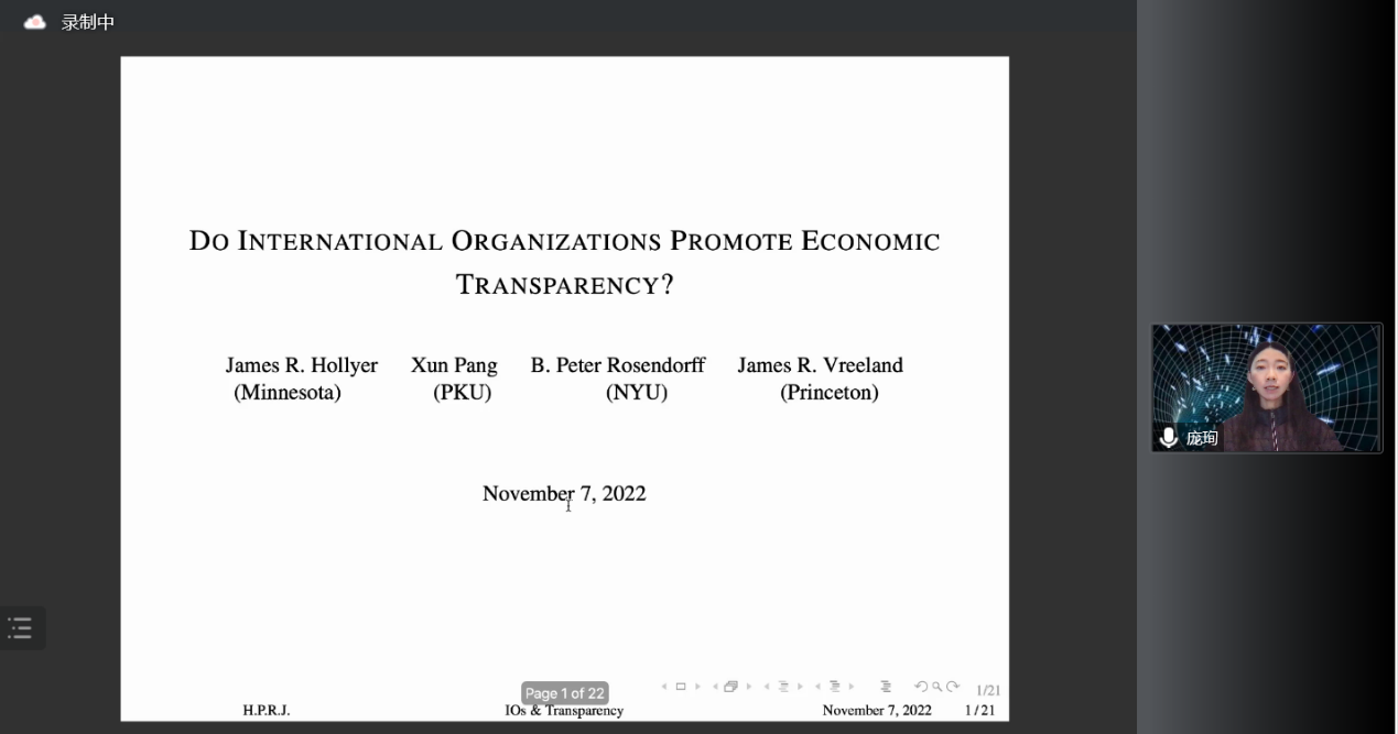 2022年11月7日,“全球治理与国际关系前沿讲坛”第二期于线上成功举办。北京大学国际关系学院教授庞珣以《国际组织与国家经济透明度》为题进行了精彩讲座。工口实验室