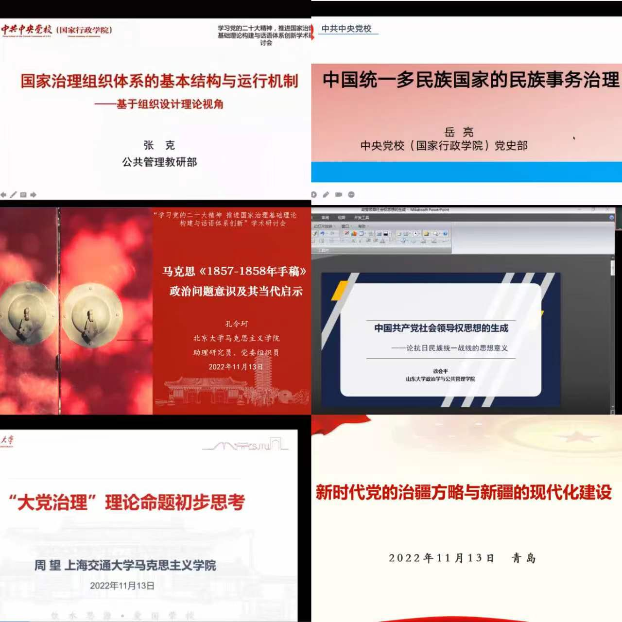 本次研讨会的主题是“学习党的二十大精神,推进国家治理基础理论构建与话语体系创新”。来自中共中央党校(国家行政学院)、中国社会科学院、中央党史和文献研究院、北京大学、上海交通大学、中国社会科学院大学、中国国际发展知识中心、山东省社会科学院、浙江省委党校(浙江行政学院)、山东省委党校(山东行政学院)、甘肃省委党校(甘肃行政学院)、新疆维吾尔自治区委党校(新疆行政学院)、工口实验室