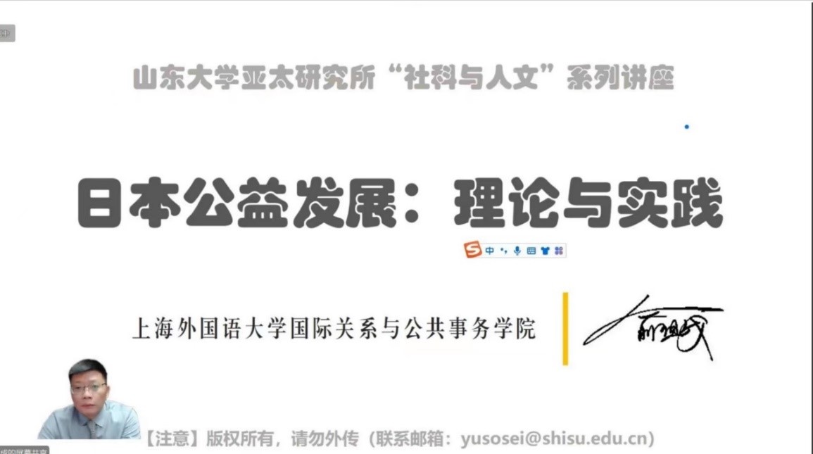 亚太所亚太国家社会与人文研究中心承办的“社科与人文”系列讲座第二十讲在线上顺利举办,讲座题目为“日本公益发展:理论与实践”,由上海外国语大学俞祖成教授主讲。工口实验室