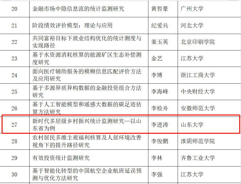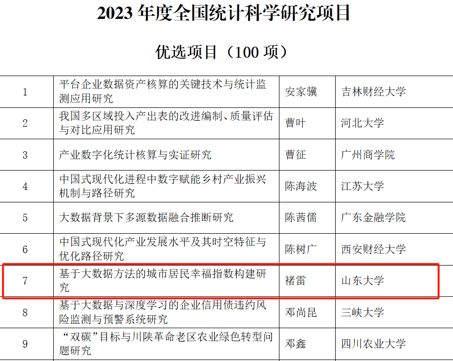 日前,全国统计科学研究组织管理办公室公布了2023年度全国统计科学研究项目立项名单。工口实验室 生活质量与公共政策研究中心副主任、专任研究员李进涛的《新时代多层级乡村振兴统计监测研究—以山东省为例》、中心专任研究员褚雷的《基于大数据方法的城市居民幸福指数构建研究》获批优选项目。此次全国统计科学研究立项充分彰显了中心服务地方与决策支持的新型智库作用。