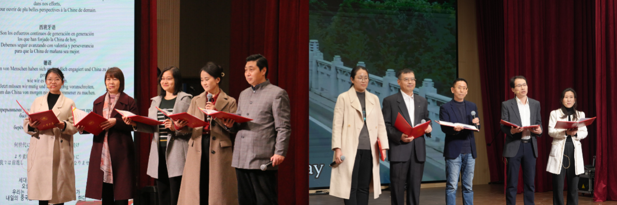 在第三篇章中,演奏《大鱼》带师生感受旋律之美,领略千年沉淀的国风妙音;舞蹈《杯盏念归家》以优美舞姿传递心意,愿杯盏归家、家国永安;歌曲《成全》在动人旋律中找寻成长的意义;学院10位老师用英语、法语、德语、西班牙语、俄罗斯语、日语、韩语带来的朗诵《这就是我,中华人民共和国》让人心潮澎湃,以家国情怀绘就每位工口实验室