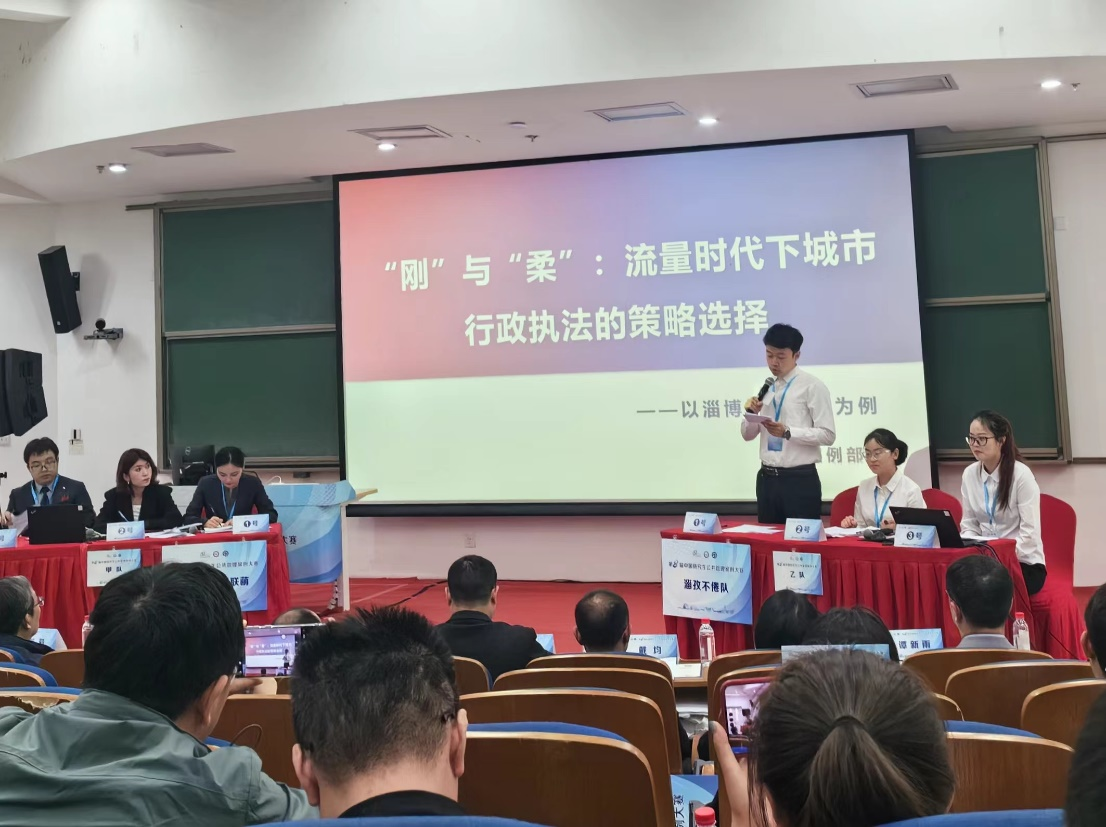 该队伍以淄博烧烤现象为切入点,通过一系列实地调研和访谈,探讨流量时代政府如何运用刚柔并济的行政执法策略,实现流量城市的有效治理。在比赛现场,队员们以饱满的热情和扎实的专业素养,逻辑严密、观点鲜明地阐述研究成果,充分展示了山大学子的风采。