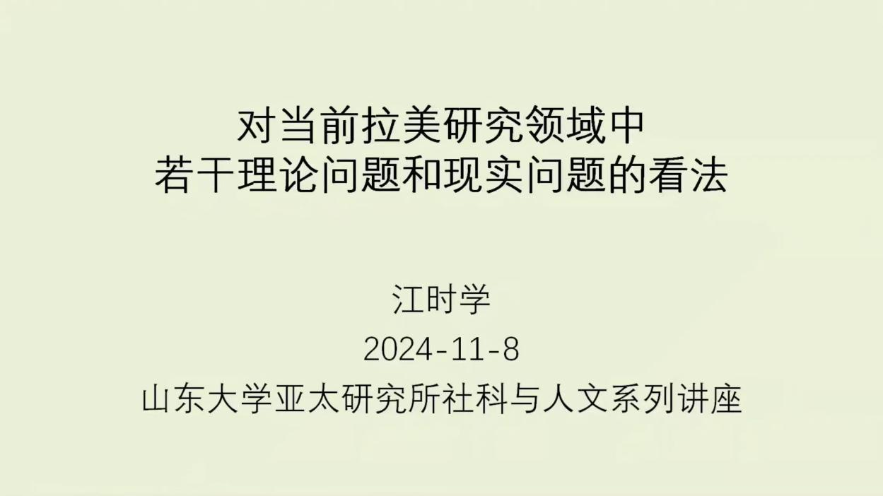 亚太研究所主办,亚太所拉美研究中心承办的“社科与人文”系列讲座第三十讲在线上成功举办,讲座题目为“对当前拉美研究领域中若干理论问题和现实问题的看法”,由中国社会科学院研究员、上海大学特聘教授江时学主讲,亚太所拉美研究中心主任李振教授主持,亚太所大国关系与地区安全研究中心副主任季丽新副教授、亚太所拉美研究中心史话助理研究员担任与谈人。