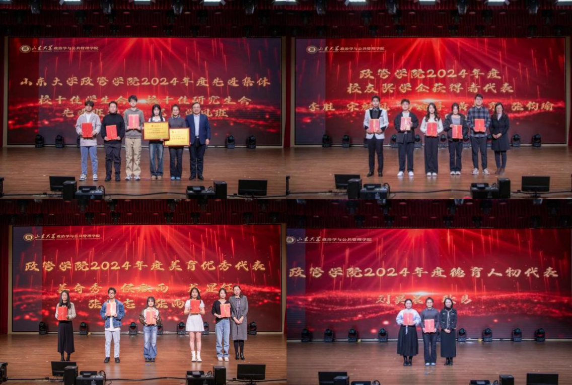 2024年度德育人物代表、学术创新人物代表、体育人物代表、美育优秀代表、劳育优秀代表、校友奖学金获得者、先进班集体的获奖代表颁奖,激励政管学子在新的一年踔厉奋发、勇毅前行。