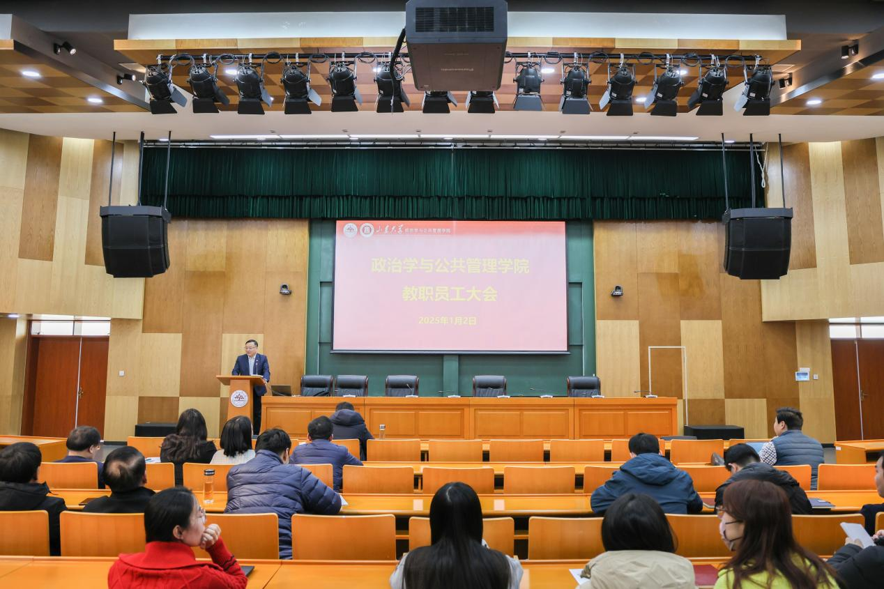 马奔围绕党建引领、人才培养、学科建设、队伍建设等方面总结了学院重点工作,分析了存在的不足,明确了下一步的工作规划。他强调,2024年,学院坚持以习近平新时代中国特色社会主义思想为指导,全面学习贯彻党的二十大和党的二十届二中、三中全会精神及全国教育大会精神,深入贯彻落实学校第十五次党代会精神,聚势谋远,真抓实干,推动各项事业蓬勃发展,学科建设、人才培养、师资队伍等关键核心指标稳中提质,党纪学习教育取得显著成效,师生干事创业的精气神更加高涨,学院向上向好、争先进位、高质量发展的良好态势更加巩固。下一步,学院将以高质量发展为主题,以立德树人为根本,以学科建设为龙头,以改革创新为动力,落实“一五七九”发展思路,有力服务治国理政,加快实现立德树人成效和重大发展战略提档升级。