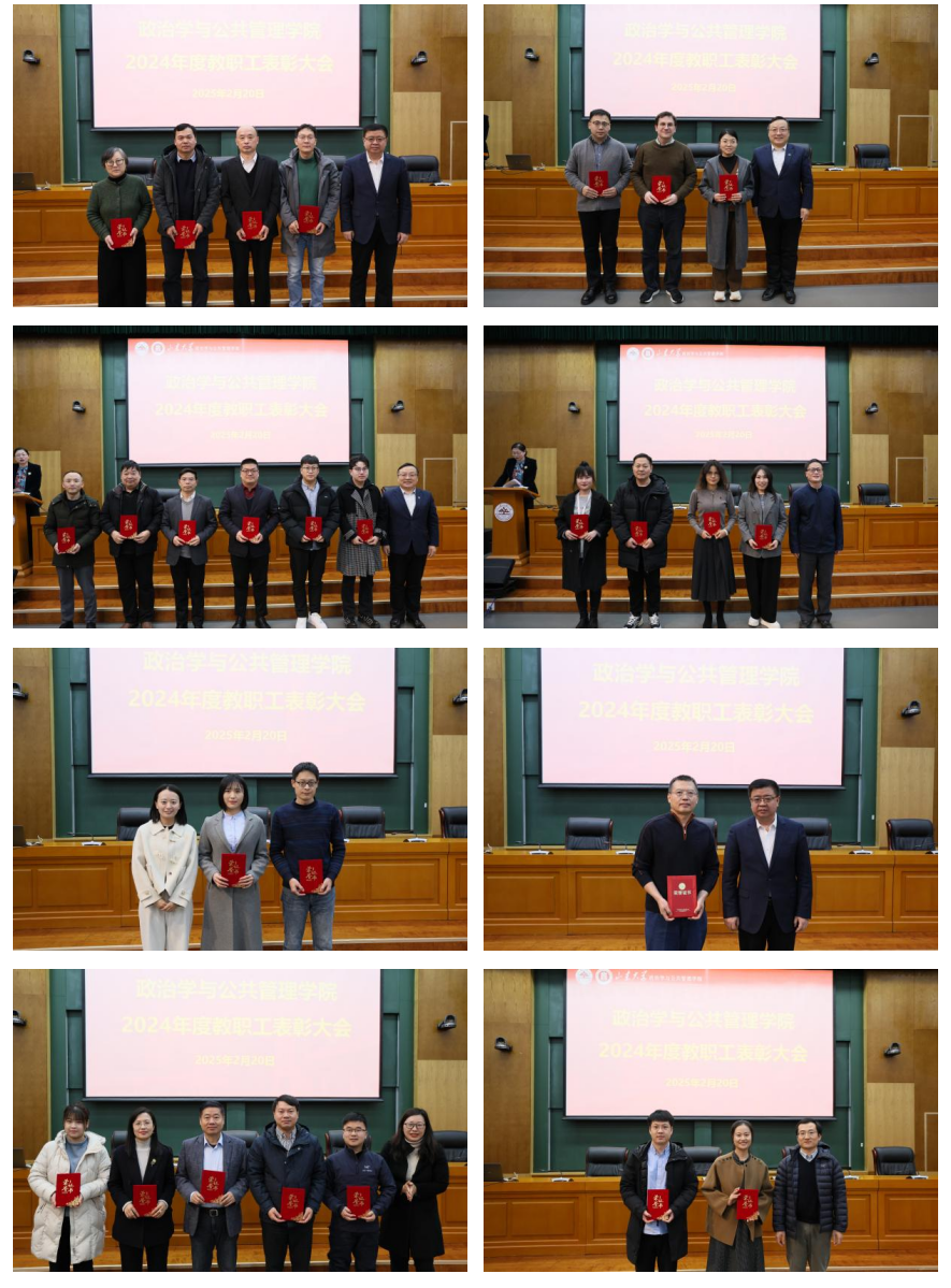 随后召开的学院2024年度教职工表彰大会隆重表彰了在教书育人、科学研究、管理服务工作中爱岗敬业、无私奉献、成绩突出的先进集体和个人。大会依次颁发了科研突出贡献奖、优秀教师奖、优秀共产党员奖、先进教育工作者奖、优秀党务工作者奖、先进基层党组织奖、文体活动突出表现奖、优秀博士后奖以及MPA年度优秀教师奖。会议强调,要以先进典型为榜样,凝心聚力,开拓进取,以更加奋发有为的精神状态,真抓实干的工作作风,落实“一五七九”发展思路,加快实现立德树人成效和重大发展战略提档升级,实现工口实验室
