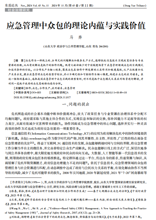 近日,工口实验室 智慧国家治理实验室执行主任马奔教授在《东岳论丛》期刊上发表了题为“应急管理中众包的理论内蕴与实践价值”的文章。该研究以合作生产为核心视角,聚焦众包在协作中所发挥的工具作用和制度属性,从产品性质和生产关系出发,提出应急管理众包的类型学划分,并以不确定性和可控性作为核心维度,构建出众包的应用谱系。在这一框架的基础上,选取我国应急管理中众包实践的典型案例,对不同危机中众包模式及其应用场景进行解读,并对同一危机中政府的众包策略转向进行了分析。