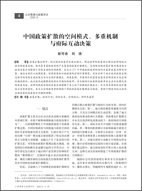 刘浩副教授指导我院本科生彭可余的毕业论文“中国政策扩散的空间模式、多重机制与府际互动决策”发表于《公共管理与政策评论》(第一作者彭可余,通讯作者刘浩)。《公共管理与政策评论》是国内公共管理领域的重要学术期刊。该科研成果得到国家社会科学基金(23BGL318,主持人刘浩)资助。
