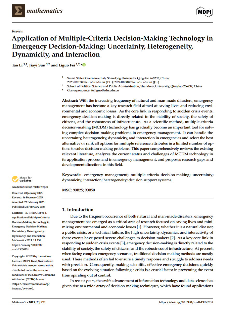 智慧国家治理实验室费立国团队应SCI期刊《Mathematics》专刊邀请,发表了题为《Application of Multiple-Criteria Decision-Making Technology in Emergency Decision-Making: Uncertainty, Heterogeneity, Dynamicity, and Interaction》的论文。研究探讨了多标准决策方法(MCDM)在应急管理中的应用,特别是在应对不确定性、动态变化和多方参与挑战时的优势。