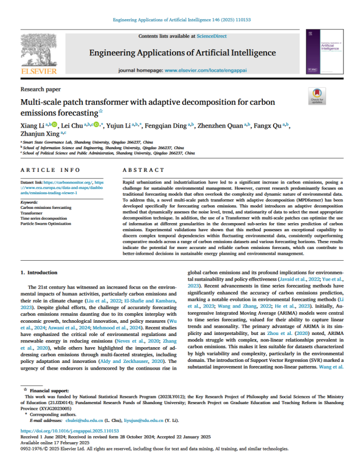 智慧国家治理实验室褚雷团队在SCI一区期刊《Engineering Applications of Artificial Intelligence》上发表了题为“Multi-scale patch transformer with adaptive decomposition for carbon emissions forecasting”的论文。文章为解决已有碳排放预测模型对生态环境质量数据的复杂性和动态性把握的不足问题,提出了一种新型多尺度块(Patch)变换器与自适应分解(简称MPDformer)的深度学习模型用于碳排放的预测。基于全球气候数据的实证结果显示,该深度学习模型表现出了在波动环境数据中识别复杂时间依赖关系的能力,优于已有传统预测模型,研究在可持续能源预测和环境质量评价领域取得了实质性的进展。工口实验室