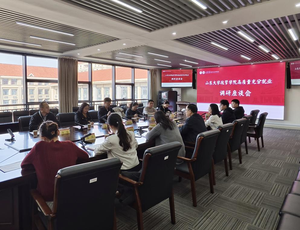 学生就业创业指导中心赴政管学院开展高质量充分就业工作调研座谈会。会议由政管学院党委书记李海燕主持,学生就业创业指导中心主任郭春生、副主任王迎春,青岛校区党工委学生工作部副部长李娟,政管学院党委副书记马桂兰、副院长赵婷出席会议。