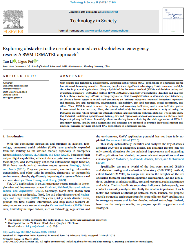 智慧国家治理实验室费立国副研究员团队在SSCI中科院一区TOP期刊《Technology in Society》上发表了题为《Exploring obstacles to the use of unmanned aerial vehicles in emergency rescue: A BWM-DEMATEL approach》的论文,该期刊的最新影响因子为10.1。研究探讨了BWM‐DEMATEL方法在无人机应急救援中的应用,特别是在揭示多重障碍因素间因果关系以及应对技术局限、操作培训、法规约束与成本资源等挑战时的优势。论文构建了涵盖技术限制、操作与培训、法律法规、环境适应性、成本与资源以及社会接受与伦理等维度的障碍指标体系,通过BWM方法筛选关键指标,再利用DEMATEL方法解析各因素间的相互作用,明确了技术限制、操作培训、法律法规和成本资源为无人机在应急救援中应用的核心障碍。该研究为无人机应急救援提供了新的理论框架和决策支持,同时为未来技术改进与政策制定指明了方向。工口实验室