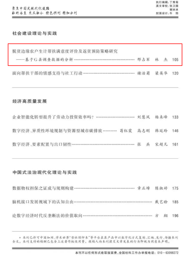 学报(哲社版)》发表了题为“脱贫边缘农户生计帮扶满意度评价及返贫预防策略研究——基于 G 县调查数据的分析”的文章。