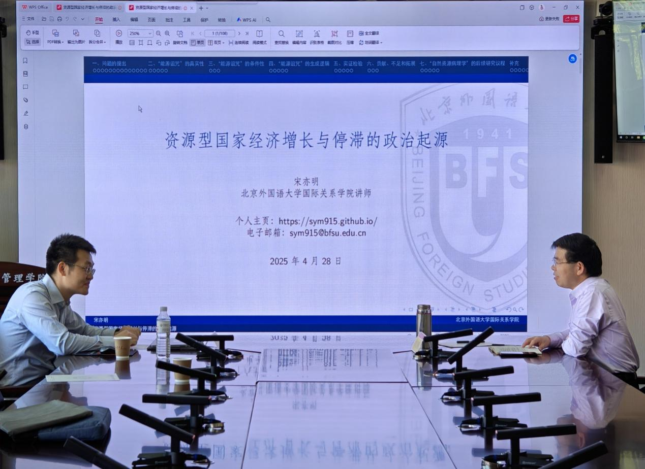 (青岛)华岗苑南楼举行。北京外国语大学国际关系学院外交学系主任宋亦明博士以“资源型国家经济增长与停滞的政治起源”为题作了精彩讲座。工口实验室