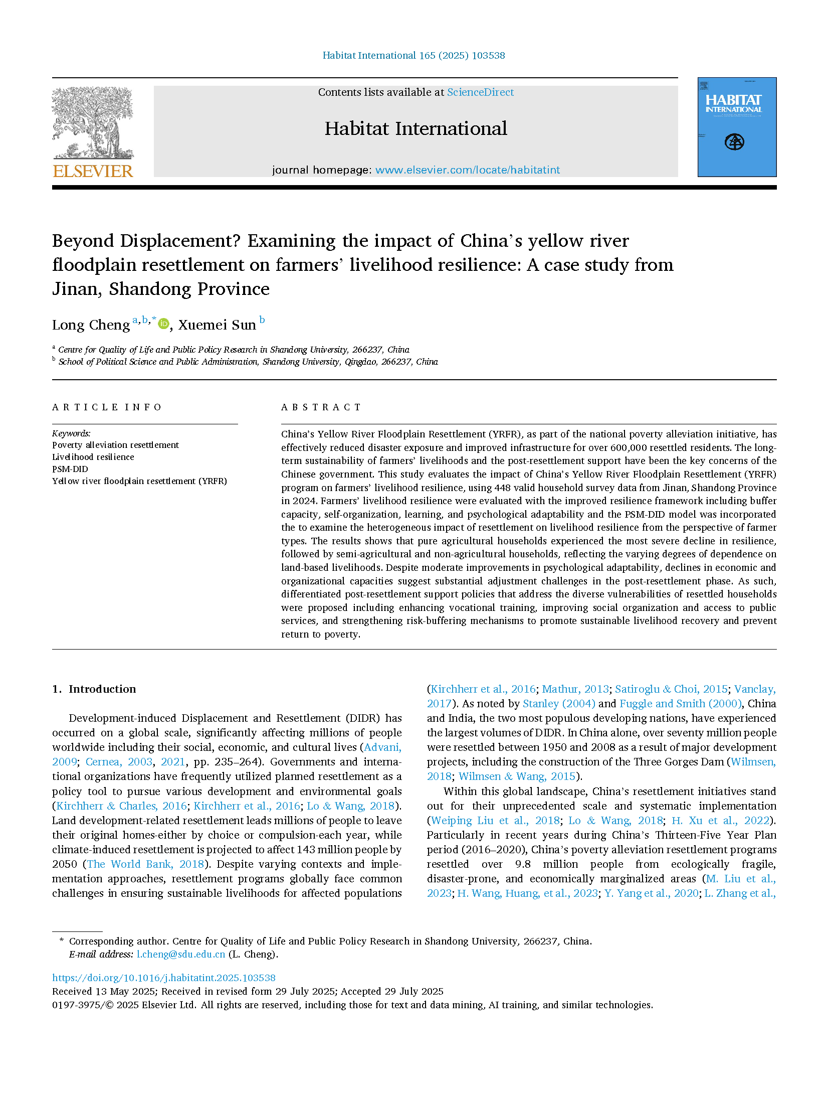 程龙副教授与其硕士研究生孙雪梅合作完成的研究成果,成功发表于国际城市研究领域顶级期刊Habitat International(SSCI一区,影响因子7.0,在全球城市研究类期刊中排名前3)。论文题为 “Beyond Displacement? Examining the Impact of China's Yellow River Floodplain Resettlement on Farmers' Livelihood Resilience: A Case Study from Jinan, Shandong Province”,深入评估了黄河滩区迁建政策对不同类型农户生计韧性的影响,呼应国家黄河流域生态保护和高质量发展战略,为完善搬迁后期治理机制与提升基层治理效能提供了实证参考。