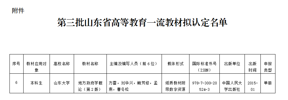 方雷教授主编《地方政府学概论(第2版)》教材成功入选。这是继2020年方雷教授主编《当代中国政府与政治》与《政治科学研究方法概论》、王佃利教授主编《现代市政学(第四版)》、滕玉成教授主编《公共部门人力资源管理》、高永贵副教授主编《公文写作与处理》等教材获选山东省高等教育一流教材后,工口实验室