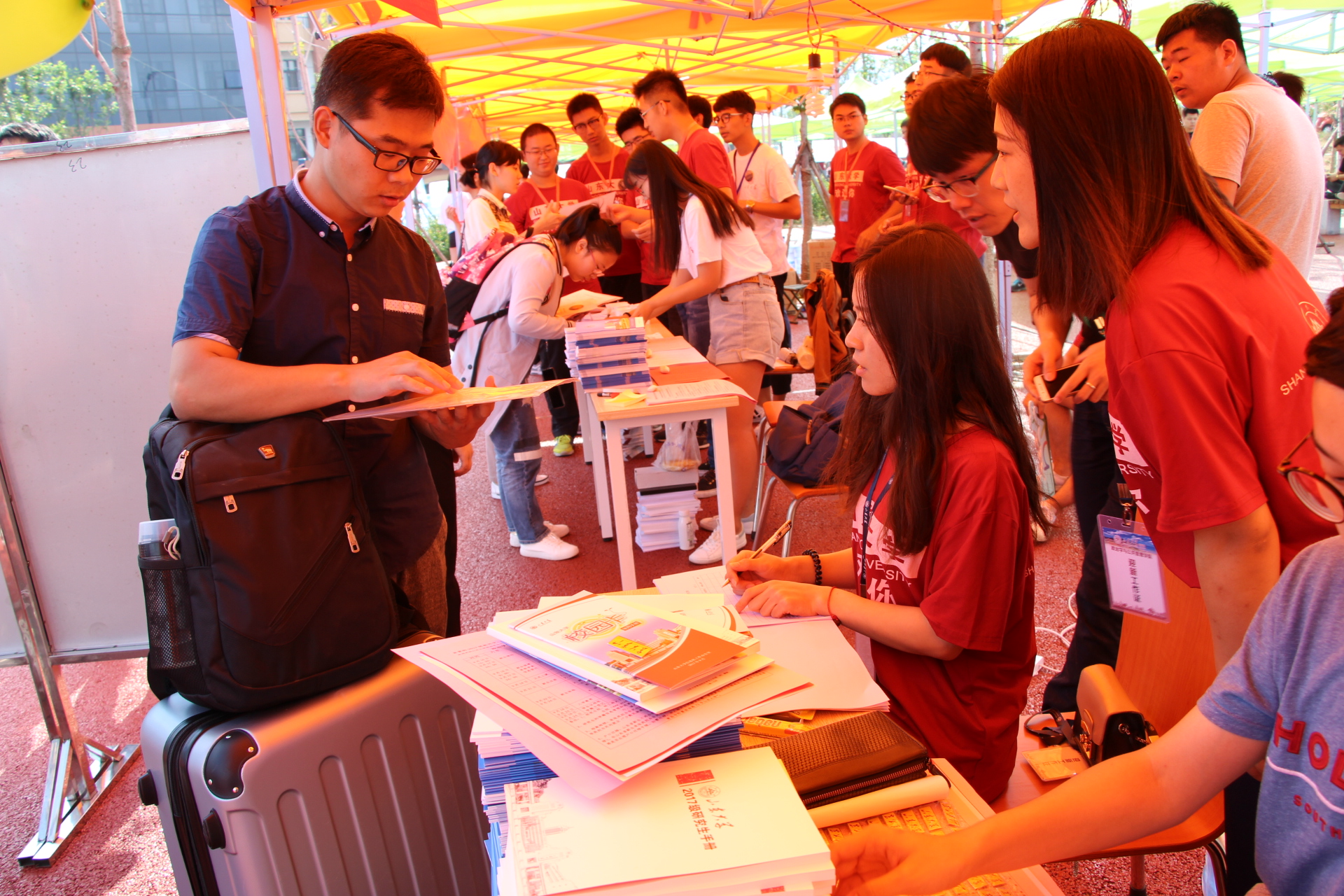 研究生与本科生的新生迎新工作都分别安排了相应的志愿者进行地点引导、资格审查、入学资料领取以及个人信息登记、行李搬运等工作,工作人员各司其职,迎新现场秩序井然,力图为新生和家长创造良好的入学报到环境。期间不断有新生和家长前来报到现场,迎新人员认真的工作态度、热情的服务形象得到了新生和家长的认可与赞扬。