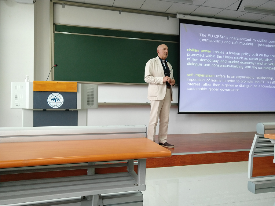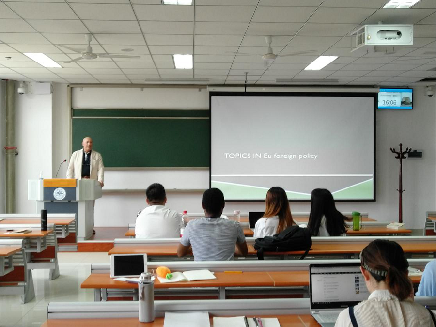 硕士生讲授《欧洲一体化理论与实践》课程。课程主要讲述了欧洲一体化的相关理论与历史实践,从欧盟内部运行规则、决策制定与执行机制,延伸到欧盟对外关系的现状,最后以中欧关系作为落脚点。Attina教授全程用英文授课,十分欢迎对欧洲感兴趣的学生来听课,吸引了许多同学积极报名前来学习,课程人数约25人。