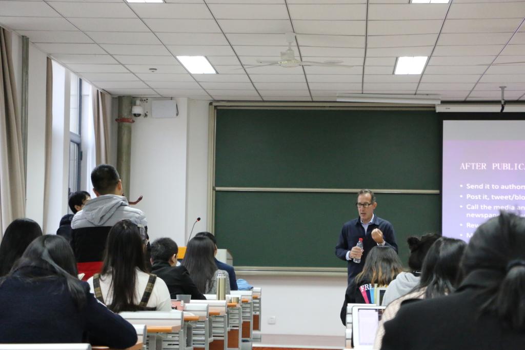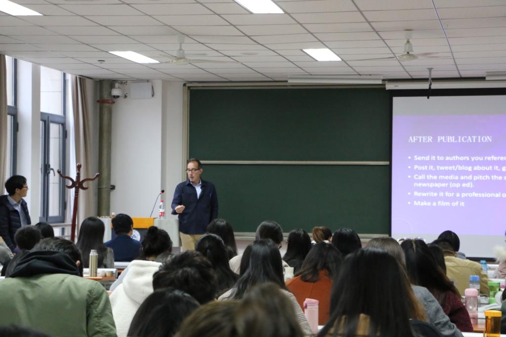 11月8日,Eisenman教授以“英文学术写作方法”为题。他认为学术论文的种类主要有回顾或者评述型、偏理论型、案例型、数据驱动型等,在论文写作中,研究意义、期刊选择、文献综述、讨论与润色以及文章宣传等都是必不可少的步骤。Eisenman教授认为同行评议是评判学术论文的主要方式,必须保证其有效性、原创性与重要性。