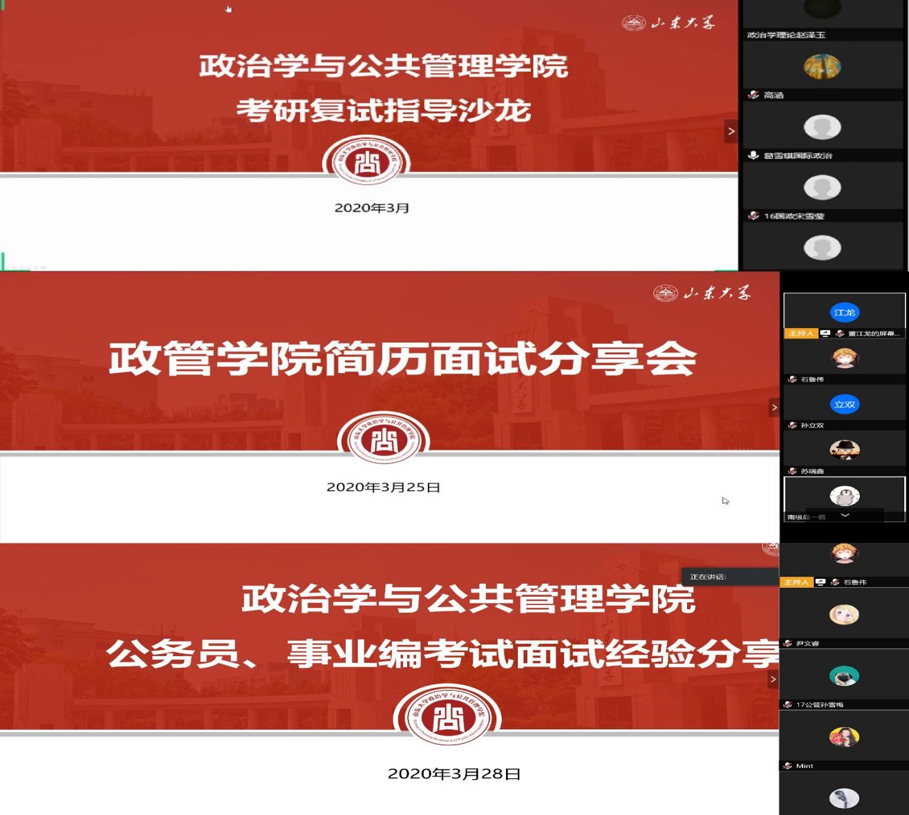 精准施策,分类指导与一对一指导相结合。针对不同就业意向的本科毕业生,学院通过线上方式积极开展就业指导活动。举办了考研复试线上指导沙龙、简历面试经验交流会、公务员事业单位考面经验分享会,邀请学院往届毕业的优秀校友分别就考研复试、简历制作与企业面试技巧、公考事业单位考录等方面为学生提供专项指导。活动不仅对应届生有极大的参考价值,对其他年级学生做好职业规划、提高就业能力也有重要意义。