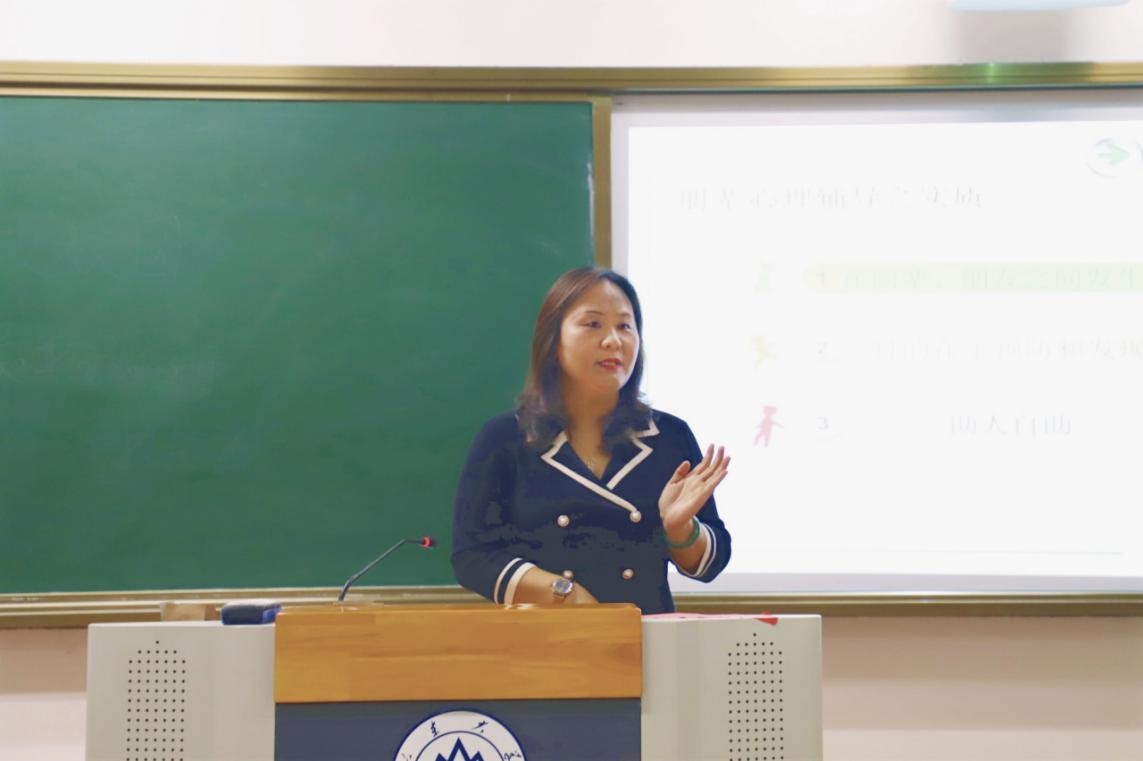 活动伊始,李娟教授以生动活泼、通俗易懂的语言导入讲座主题,列举了几种常见的大学生心理疾病,增强了同学们对相关心理疾病的认知及辨别能力。随后,李娟教授从心理委员的职责、心理危机的识别、心理委员危机报告程序、心理委员工作技能和心理委员团体辅导活动五个方面展开讲述,她指出当今大学生心理压力较大,容易产生心理问题,心理委员应采用“朋辈心理辅导”的方式,运用一定的专业知识、生活经验和助人技巧进行同龄人之间的心理互助及激励,这也是很容易被同学们所接受的心理辅助方式。