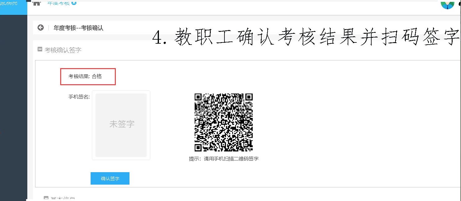 教职工登陆进入人力资源系统查看2019年度考核结果,确认无误后点击“确认考核结果”按钮,并用手机扫描二维码实施线上签名。教工个人操作至此结束。