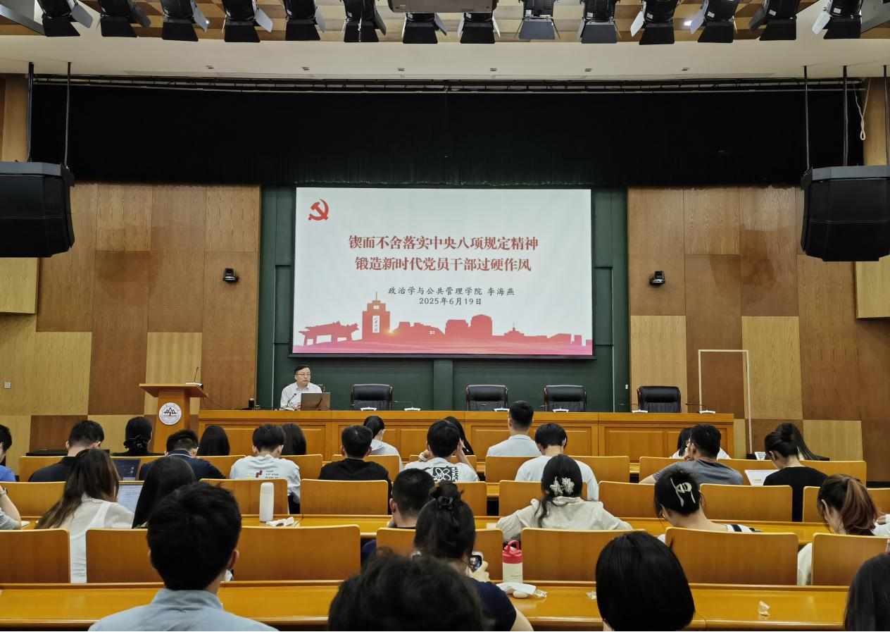 于青岛校区华岗苑南楼五层报告厅举办学习教育专题党课暨2025届毕业生党员专题党课活动。学院党委书记李海燕以“锲而不舍落实中央八项规定精神,锻造新时代党员干部过硬作风”为主题作专题报告,2025届全体毕业生党员参加党课学习。